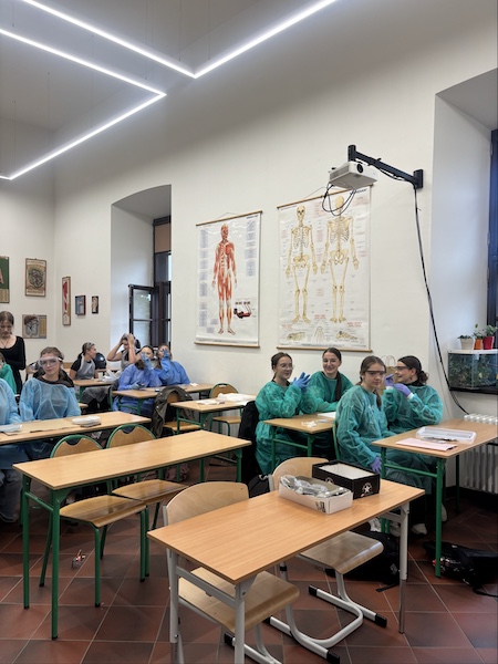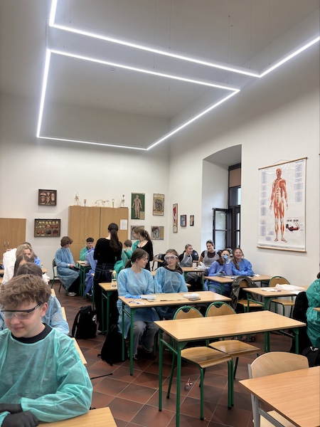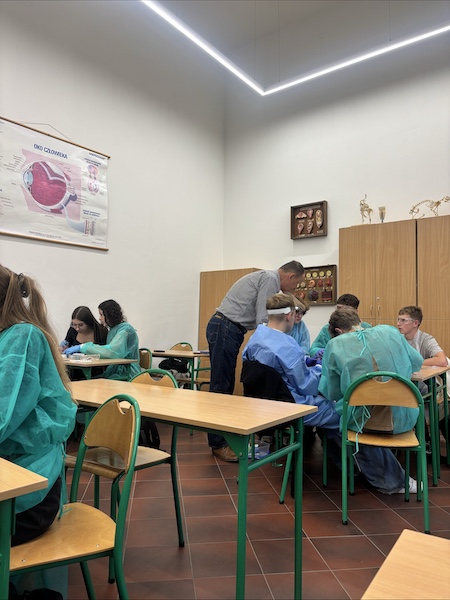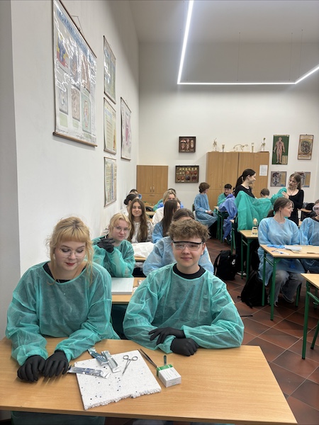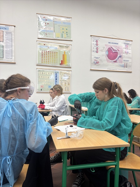 Podczas zajęć uczniowie klasy III G (profil medyczny) w grupach przeprowadzali sekcję serca wieprzowego, poznając jego budowę zewnętrzną i wewnętrzną. Pod opieką nauczyciela obserwowali główne elementy anatomiczne, takie jak: przedsionki, komory, zastawki oraz naczynia krwionośne. W trakcie pracy omawiano funkcje poszczególnych struktur i porównywano serce wieprzowe z ludzkim jako modelem budowy serca ssaków. Zajęcia miały charakter praktyczny – uczniowie pracowali w rękawiczkach i odzieży ochronnej, samodzielnie wykonywali preparaty oraz dokumentowali obserwacje wykonując dokumentację cyfrową.