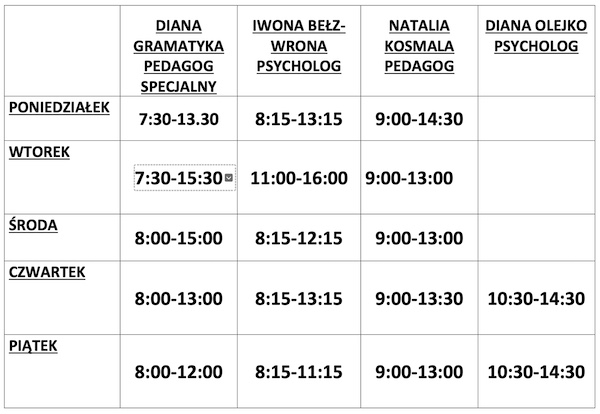 Informujemy, że w roku szkolnym 2025/2026 specjaliści szkolni pracują w następujących godzinach: